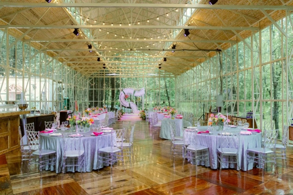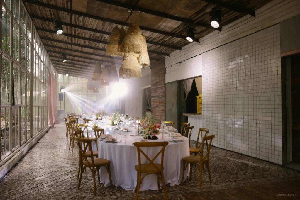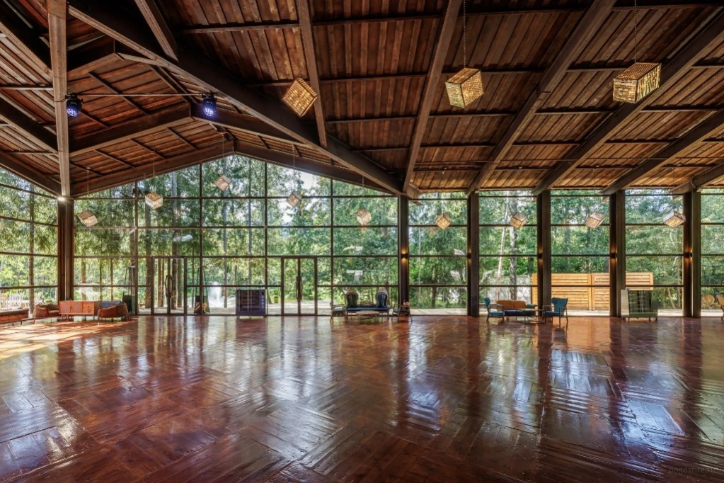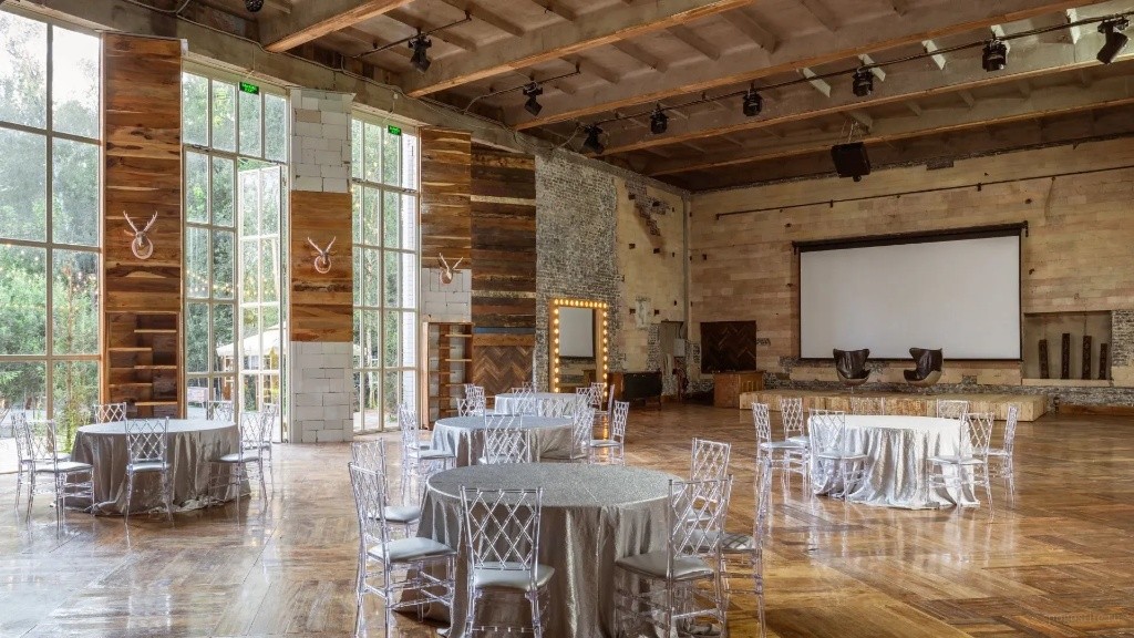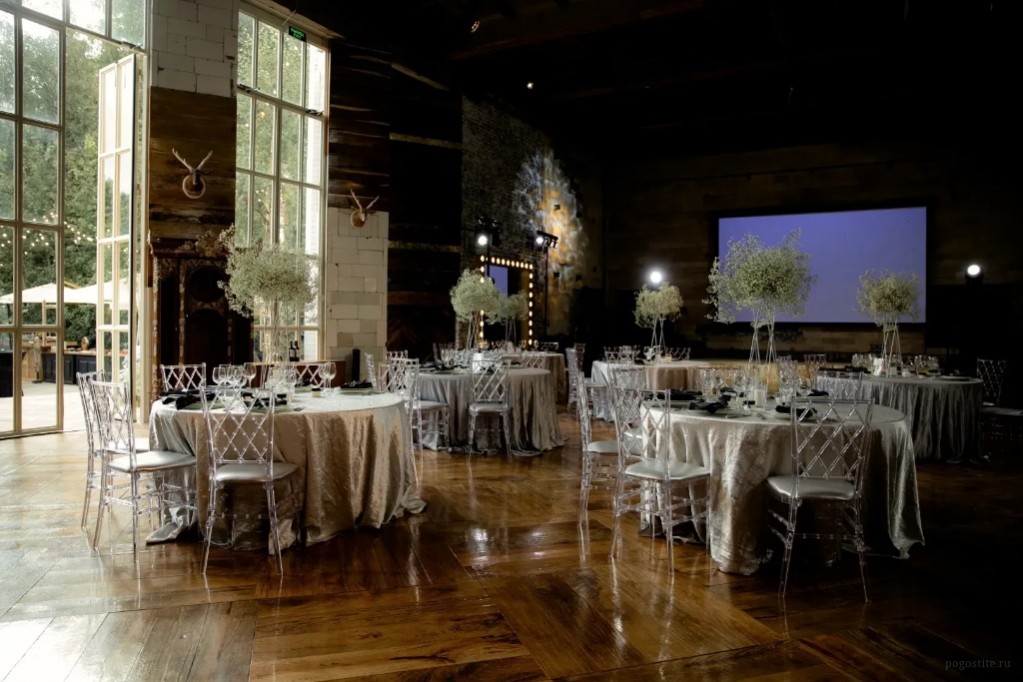 Зал MAHOGANY TERRACE (300 кв.м.) рассчитан до 400 человек. Пространство, где потолки так высоки, что кажется, будто кроны сосен заглядывают внутрь Стоимость аренды пространства: