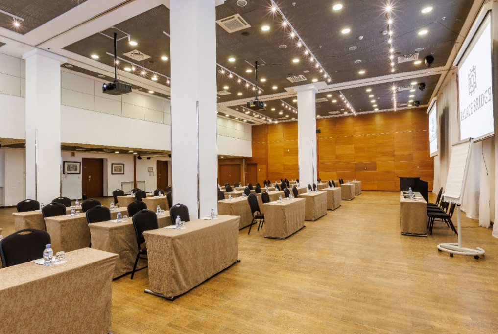 Конференц-зал ФОКСТРОТ (92 кв.м./на 80 человек). Конференц-зал Фокстрот - четверть большого Бального зала отеля PALACE BRIDGE HOTEL (бывш. СОКОС ПАЛАС БРИДЖ). Высокие потолки отличная освещенность и техническое оборудование, великолепный сервис — перед Вами идеальная площадка для мероприятий как делового, так и развлекательного формата. Зал на 80 человек подойдет для проведения презентации, семинаров, тренингов, гала-ужинов, корпоративов.