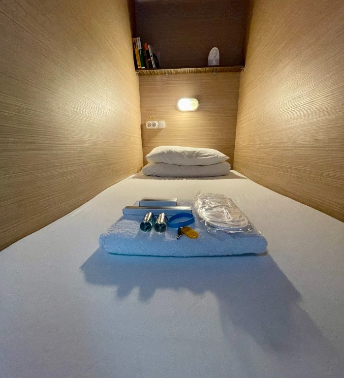 Номерной фонд представлен уютными капсулами с современным интерьером и постельным бельем.