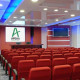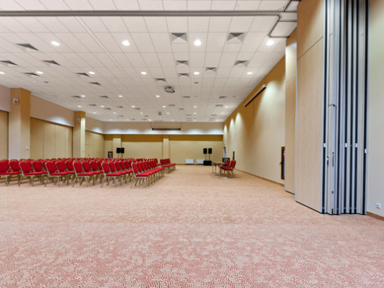 Зал-трансформер ДУНАЙ (550 кв.м. /440 посадочных мест). Зал оснащен кафедрой, микрофонами, двумя экранами, двумя проекторами, системой звукоусиления, флипчартом, маркерами. Трансформируется на 5 залов: 290 кв.м., 190 кв.м., 90 кв.м. и 2 зала площадью 50 кв.м.