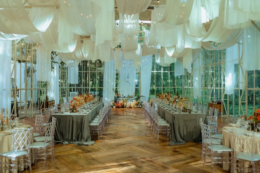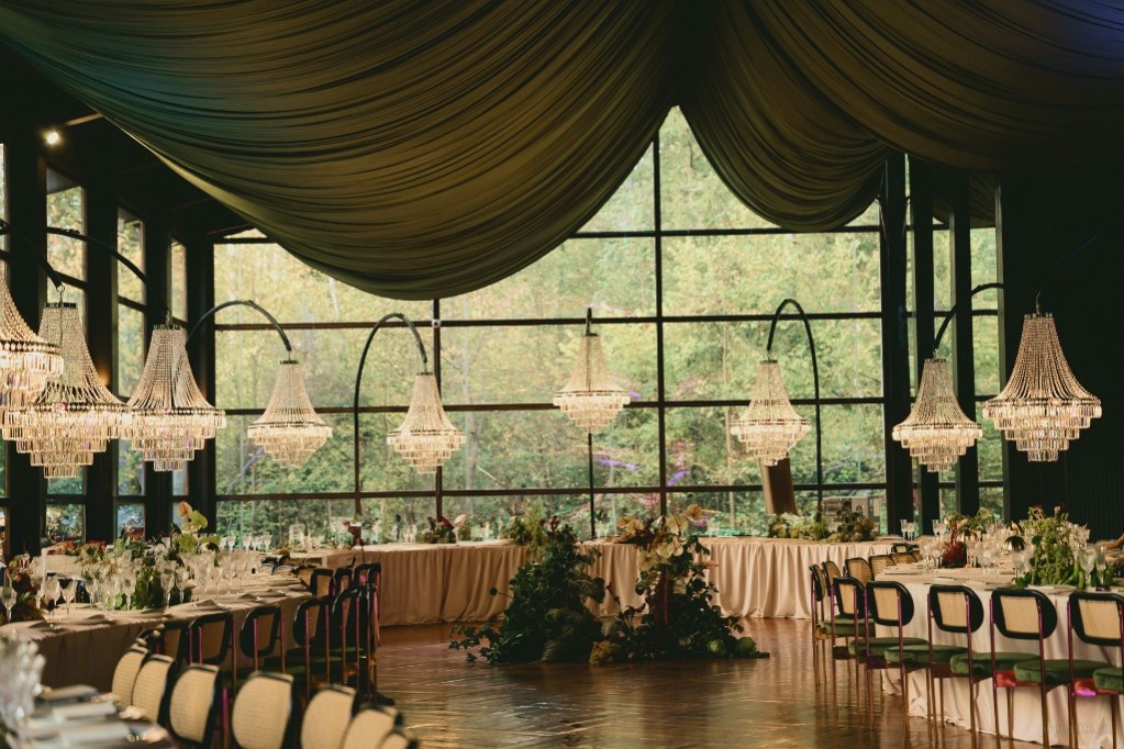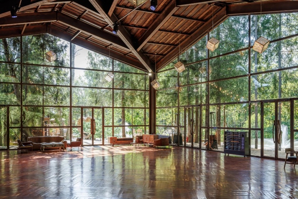 Зал MAHOGANY TERRACE (300 кв.м.) рассчитан до 400 человек. Пространство, где потолки так высоки, что кажется, будто кроны сосен заглядывают внутрь Стоимость аренды пространства:
