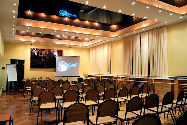 Конференц-зал «Золотой» понравится своими черными натяжными потолками и оригинальной подсветкой. Вместимость зала – 60 – 80 человек рассадкой театром.