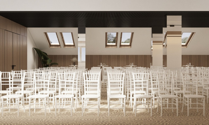 Площадка выполнена в простом, но стильном деловом дизайне. Возможна аренда зала с вместимостью от 20 до 180 человек, что делает его идеальным для проведений встреч, семинаров и корпоративов. Просторный светлый зал с высокими потолками и колоннами, наполненный естественным светом, создает приятную рабочую атмосферу, способствуя активному и продуктивному взаимодействию. При желании могут быть предоставлены стулья с пюпитрами.