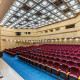 Киноконцертный зал (332 кв.м.) вмещает до 300 человек. Сочетает комфорт, современное оснащение и элегантный интерьер, что делает его идеальной площадкой для конференций, пленарных заседаний, торжественных церемоний и эксклюзивных показов. Просторный зал оборудован встроенным стационарным киноэкраном, сценой, профессиональной световой аппаратурой и аудиосистемой, обеспечивающей чистое и качественное звучание. Мягкие кресла с откидными столиками создают комфорт для всех участников, а деревянная отделка стен придает помещению солидный и уютный вид. Для международных мероприятий предусмотрены кабины для синхронного перевода, а отдельные помещения на балконе и гримерные комнаты позволяют организовать трансляции, подготовку спикеров и презентационные выступления на высшем уровне. Особенности и преимущества: