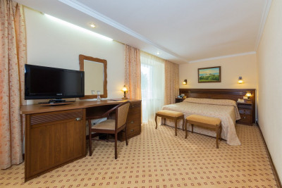 Однокомнатные номера Высшей категории, представлены в двух вариантах: с одной двуспальной кроватью или двумя раздельными. Возможно размещение двух дополнительных мест и детской кроватки.