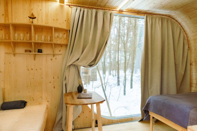 Уютный, отдельно стоящий домик-капсула оснащен большим панорамным окном с зеркальным напылением.