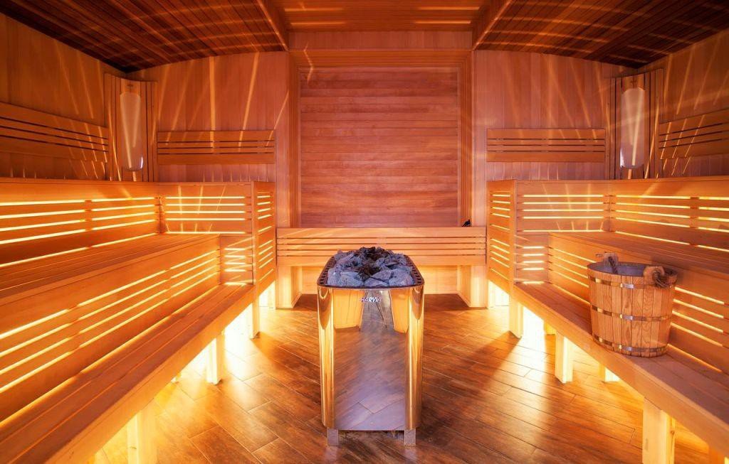 На первом этаже находится просторная гостиная с мягкой мебелью, камином и большим телевизором, кухня совмещенная со столовой, а также сауна с бассейном, комнатой отдыха и ванная
