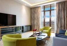Королевский люкс площадью 202 кв. м имеет обеденную зону, гостиную, спальню, гардеробную, гостевую ванную комнату и балкон с видом на горы