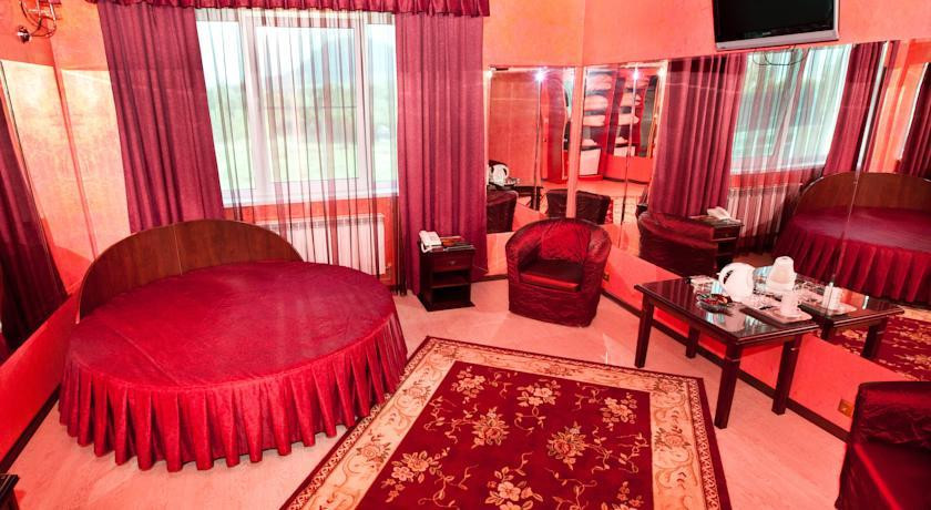 Просторный номер с круглой кроватью, шкафом для одежды и журнальным столиком. В ванной комнате имеются тапочки и халаты.