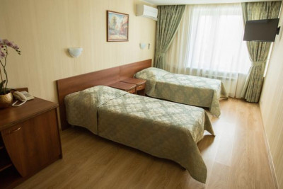 по две кровати в каждом номере, шкаф для одежды, цветной телевизор, холодильник, письменный стол.