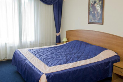 кровать, шкаф для одежды, цветной телевизор, письменный стол, холодильник и телефон. Совмещенный санузел в номере ( ванная или душевая кабина).