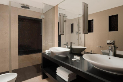The suites are decorated in soft pastel colors and feature a living room and a comfortable working area with free access to the fitness center. There is also a a flat-screen TV, a safety deposit box, a capsule coffee machine, tea and coffee facilities and mineral water. The private bathroom comes with a hairdryer, toiletries, bathrobes and slippers.